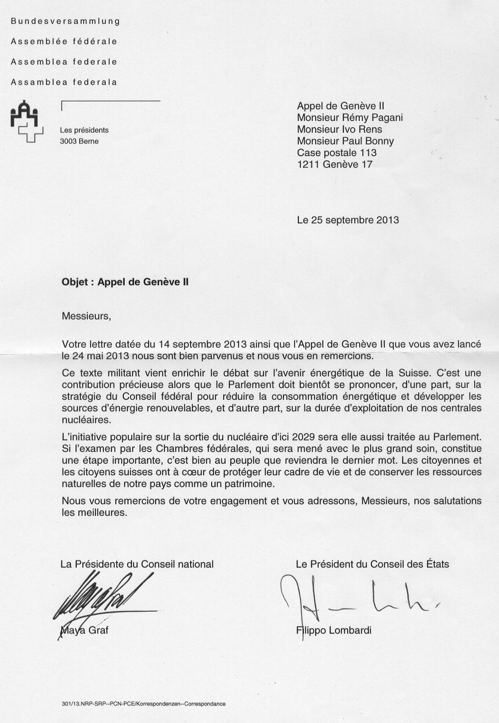 Copie aux Présidents du Conseil national, du Conseil des Etats, du Conseil d’Etat de Genève, du Grand Conseil de Genève et de la Maire de Genève.